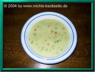 Grob zerteilte Kartoffeln und Suppengemüse und Zwiebeln in der Gemüsebrühe kochen bis alles weich ist (ein paar gegarte Möhrchen in Würfel schneiden und zurück behalten) die restliche Suppe mit dem Pürrierstab pürrieren.