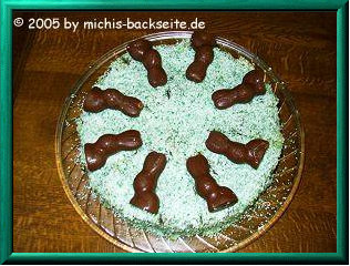 Die Torte obendrauf und am Rand mit den grünen Kokosfocken bestreuen.